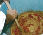 粉砕したサワガニに、天然塩と唐辛子をゆっくり混ぜ込みます。